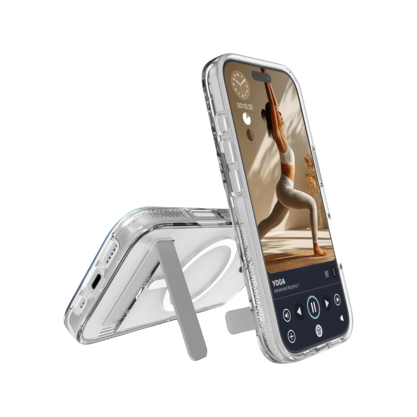 Este es el case perfecto para lucir tu nuevo iPhone. Su diseño crystal clear mantiene tu teléfono siempre impecable, protegido contra rasguños y listo para brillar. El kickstand integrado es un verdadero cambio de juego, podés apoyar el teléfono de forma segura tanto en modo retrato como paisaje.